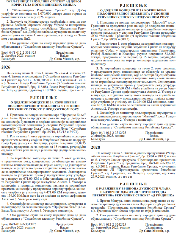 Također, Vlada je prihvatila ponudu koncesionara “Prirodno bilje” D.o.o Banja Luka za produženje roka koncesije u dužini od 15 godina na poljoprivrednom zemljištu na području Prijedora ukupne površine 32,8735 hektara. U Rješenju je ovo poljoprivredno zemljište označeno “svojinom Republike Srpske”.