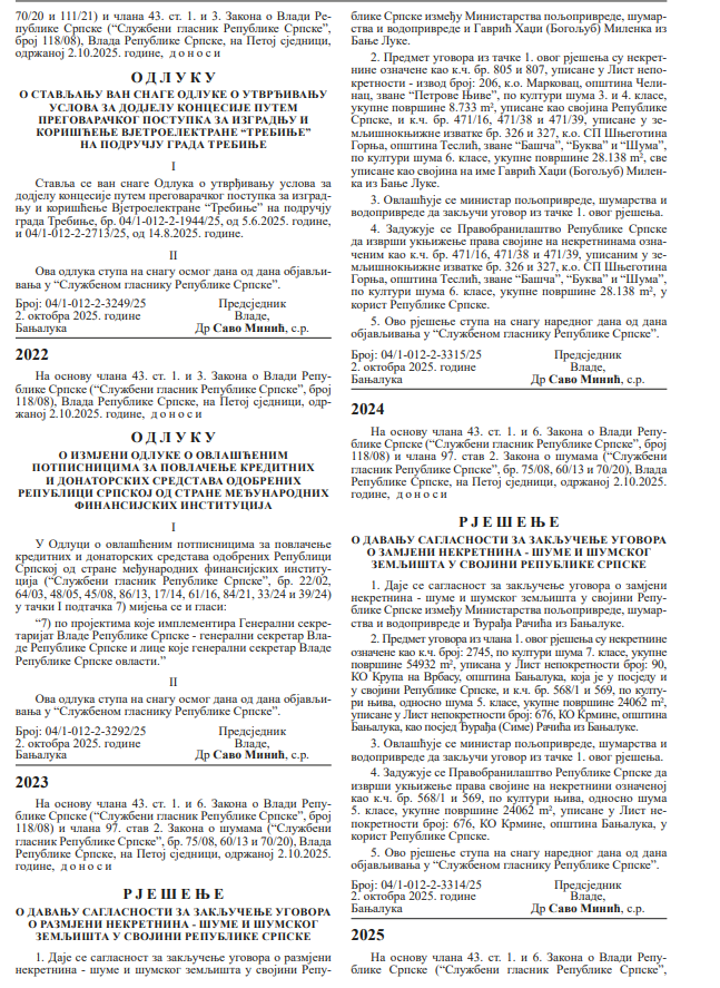 Premijer Savo Minić je 2. oktobra potpisao “Rješenje o davanju saglasnosti za zaključenje ugovora o razmjeni nekretnina-šume i šumskog zemljišta u svojini Republike Srpske”.